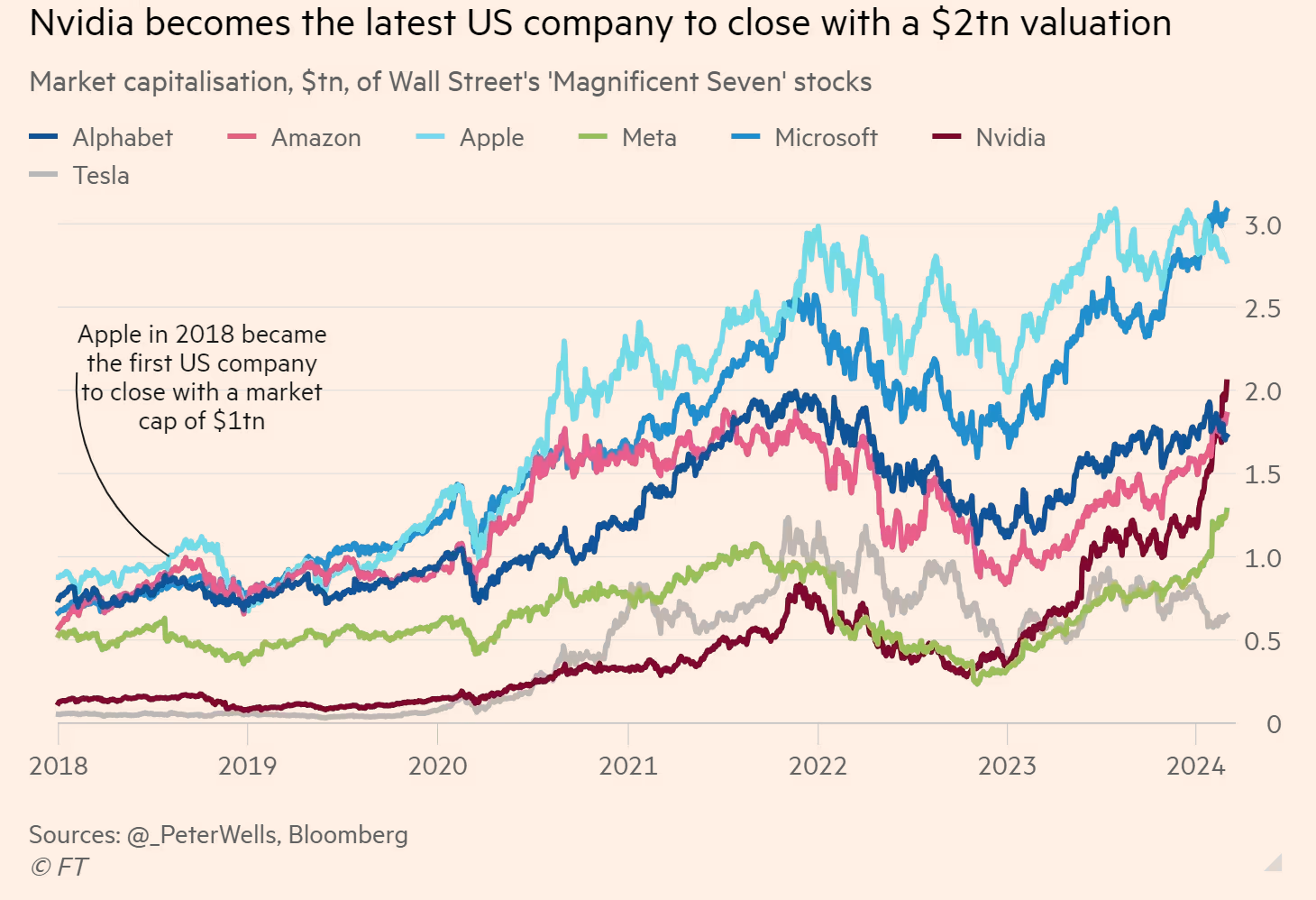 This week, we are also thinking about Nvidia. The microchip company powering the AI revolution has just become the latest US tech company to close with a $2 trillion valuation.