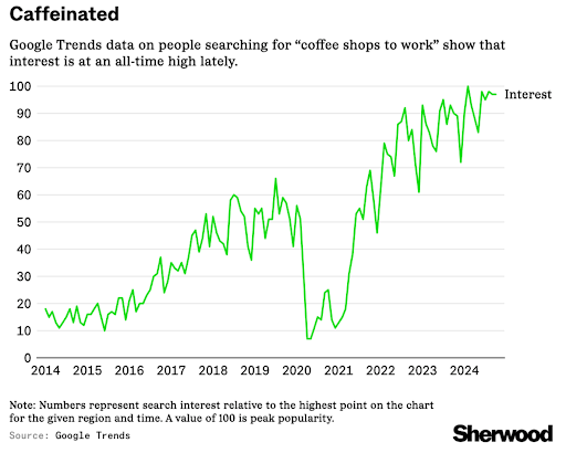 This week, we’re exploring remote work and coffee. While it seems the remote work trend has ended, people are still searching for coffee shops to work in, according to Google Trends. Is remote work really over?