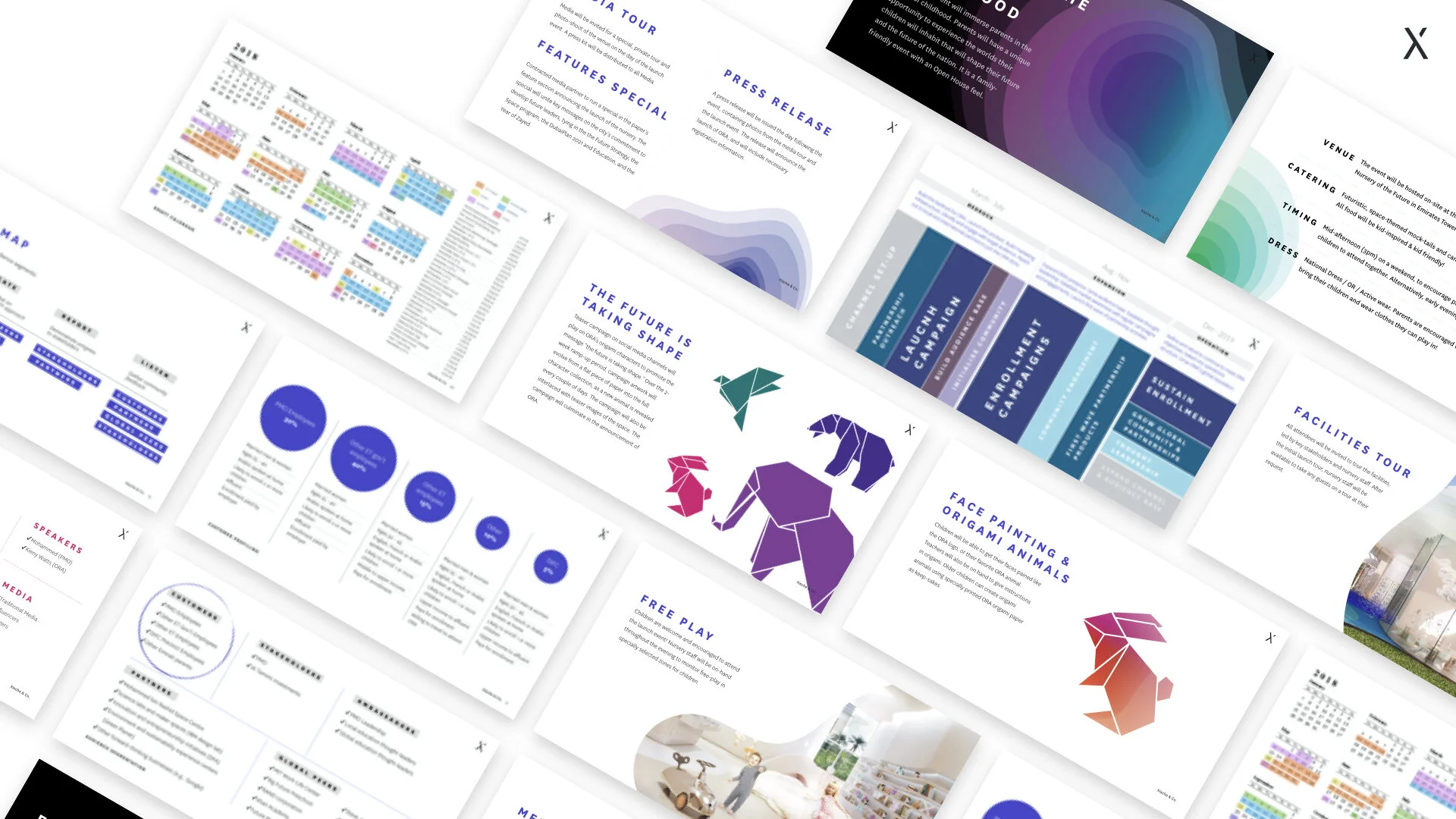 ORA, the nursery of the future, is inspired by the boundless curiosity and spirit of youth, and the hope our children inspire in all of us for a bright future. From this inspiring vision, we crafted a dynamic brand identity that married the geometric shapes and tones of the state-of-the-art facility with the essence of the brand, the aura of childhood, ideas and hope. We then conceived and developed the market positioning and go-to-market strategy for ORA communications and outreach. The final deliverable included the launch event concept and plan, and one-year marketing plan. We then trained in-house teams to manage outreach on an ongoing basis.