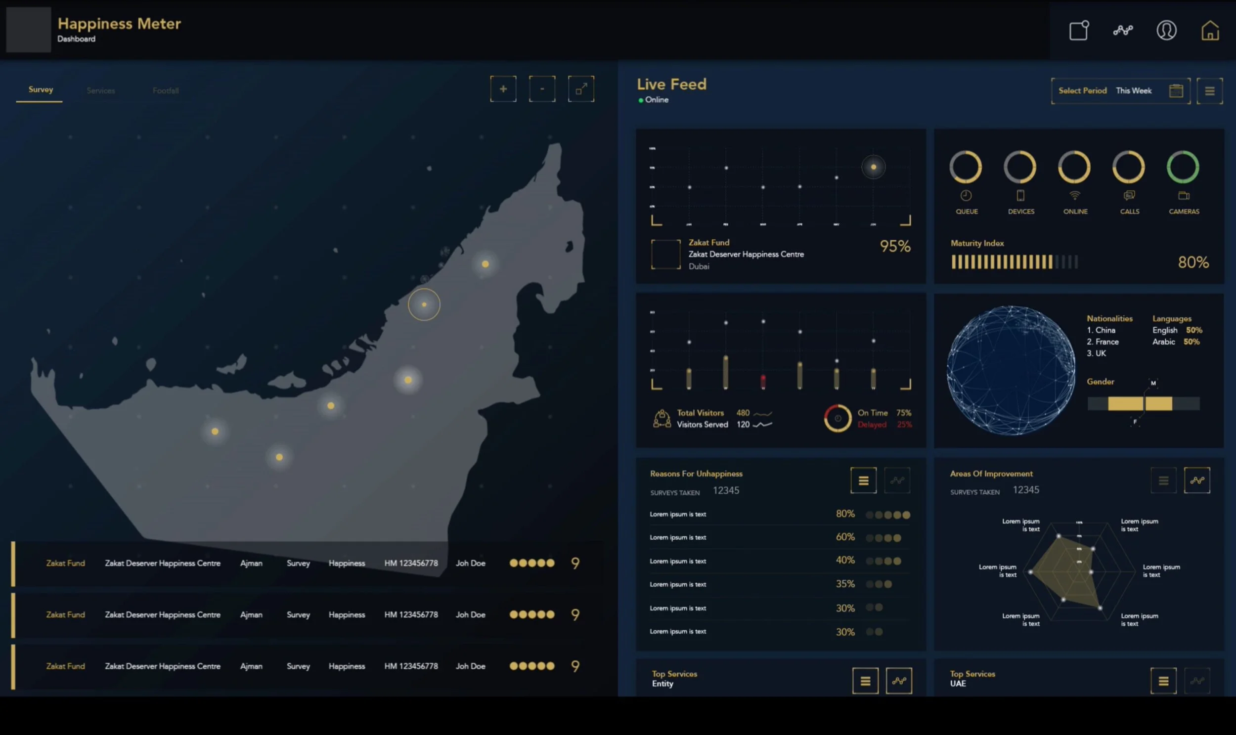 Real-time data visualization dashboard for the UAE Federal Happiness Meter initiative, connecting live data from more than 300 government service centers across the UAE.