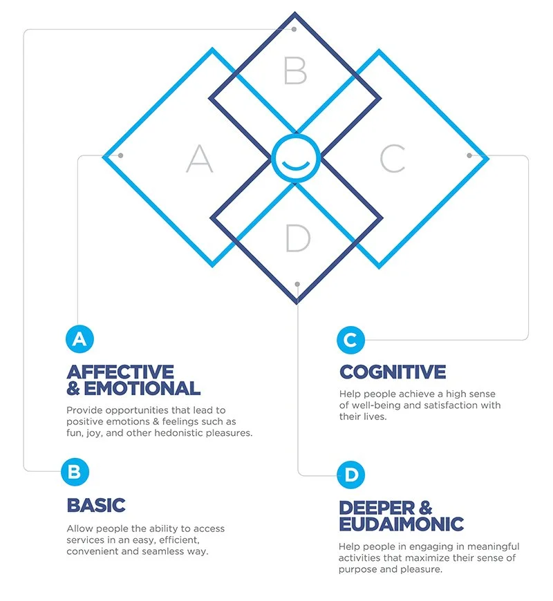 Informed by the work of Martin Seligman and Mihaly Csikszentmihalyi, our team developed an evaluative framework to prioritize city initiatives that promote individual’s happiness needs that was also sensitive to Dubai’s unique cultural context. The team identified a 90-day action plan to launch the citywide program, and led concept development for key supporting initiatives including a happiness maturity model and happiness champion program.